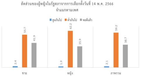 ทั้งนี้ จากผลการศึกษาของสถาบันพระปกเกล้า ภายใต้โครงการการสำรวจความคิดเห็นของประชาชนชาวไทยต่อการเลือกตั้งสมาชิกสภาผู้แทนราษฎร พ.ศ. 2566 การเลือกตั้งวันที่ 14 พฤษภาคม พ.ศ. 2566 (หลังการเลือกตั้ง) โดยสอบถามประชาชนชาวไทย จำนวน 1,500 คน เกี่ยวกับสัดส่วนของผู้หญิงในรัฐสภา โดยมีการสอบถามประชาชนว่า “ปัจจุบันเปอร์เซ็นต์ของผู้หญิงในรัฐสภาจากการเลือกตั้งครั้งล่าสุด คือ 19.6% (98 คนจาก 500 คน) พบว่า ในภาพรวมมองว่าเป็นจำนวนที่ต่ำเกินไปหรือไม่” และเมื่อพิจารณาโดยจำแนกเพศ จะเห็นได้ว่าผู้หญิงมีสัดส่วนที่คิดเช่นนี้มากกว่าผู้ชายประมาณ 7% แต่ไม่มีความแตกต่างอย่างมีนัยสำคัญทางสถิติที่ .05 (ภาพที่ 1) เช่นเดียวกับกลุ่มอายุ พบว่า กลุ่มวัยทำงานมีความเห็นว่าต่ำเกินไป เมื่อเทียบกับกลุ่มกลุ่มผู้สูงอายุ (ภาพที่ 2) ในขณะที่ผู้ตอบในภาคตะวันออกเฉียงมองว่าต่ำเกินไปมากที่สุด เมื่อเทียบกับภูมิภาคอื่น ๆ (ภาพที่ 3) (แสดงภาพในภาคผนวก 2)