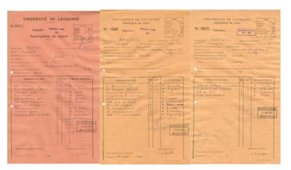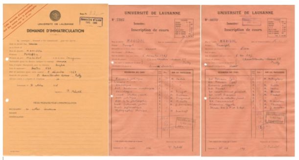 ภาพถ่ายการลงทะเบียนเรียนวิชาต่างๆของพระบาทสมเด็จพระมหาภูมิพลอดุลยเดชมหาราช บรมนาถบพิตร (รัชกาลที่เก้า) ที่มหาวิทยาลัยโลซาน สวิสเซอร์แลนด์